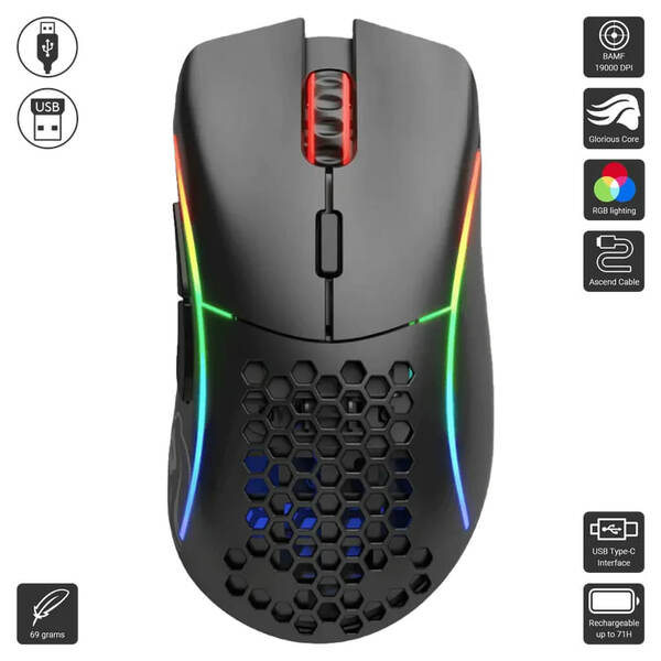 Glorious Model D Wireless Gaming Mouse - 69g Superlight, Lag Free 2.4Ghz Wireless, Up to 71 Hour Battery, RGB, BAMF Sensor, Ergonomic, 6 Buttons - Matte Black
