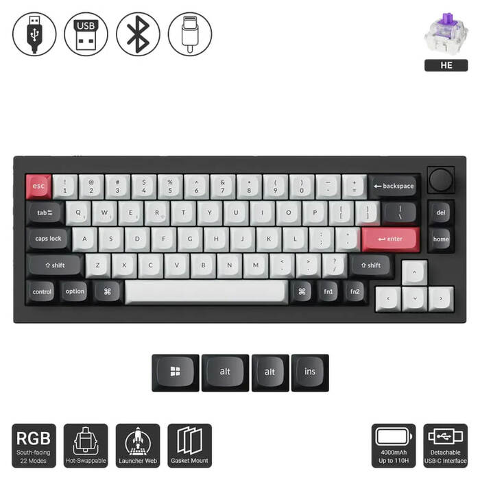 - In addition to the Hall Effect magnetic switches, the Q2 HE introduces a 2.4G connection mode with an impressive 1000Hz polling rate, further ensuring a lightning-fast gaming experience. What's more, it also boasts premium features such as Bluetooth connectivity, a double-gasket design, enhanced acoustic foams, an all-aluminum body, PBT keycaps and more.