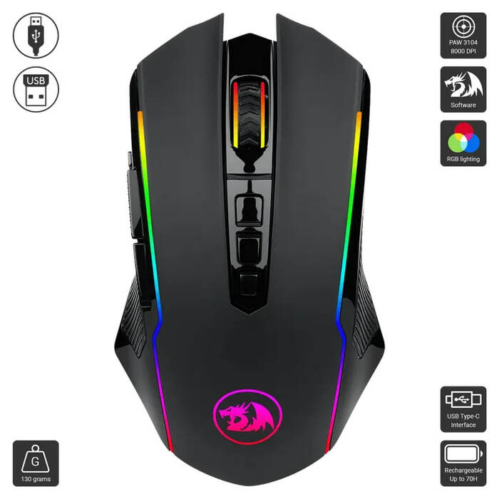 Redragon Gaming Mouse, Wireless Mouse Gaming with 8000 DPI, PC Gaming Mice with Fire Button, RGB Backlit Programmable Ergonomic Mouse Gamer, Rechargeable, 70Hrs for Windows, Mac Gamer, Black