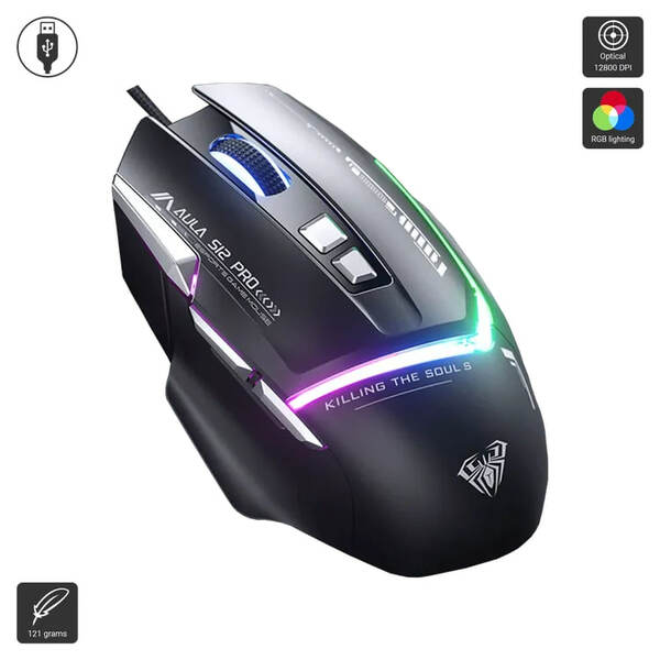 AULA S12Pro Wired Gaming Mouse,12800 DPI Optical Gamer Mouse with RGB Backlit,8 Programmable Buttons,Software Supports DIY Keybinds Rapid Fire Button