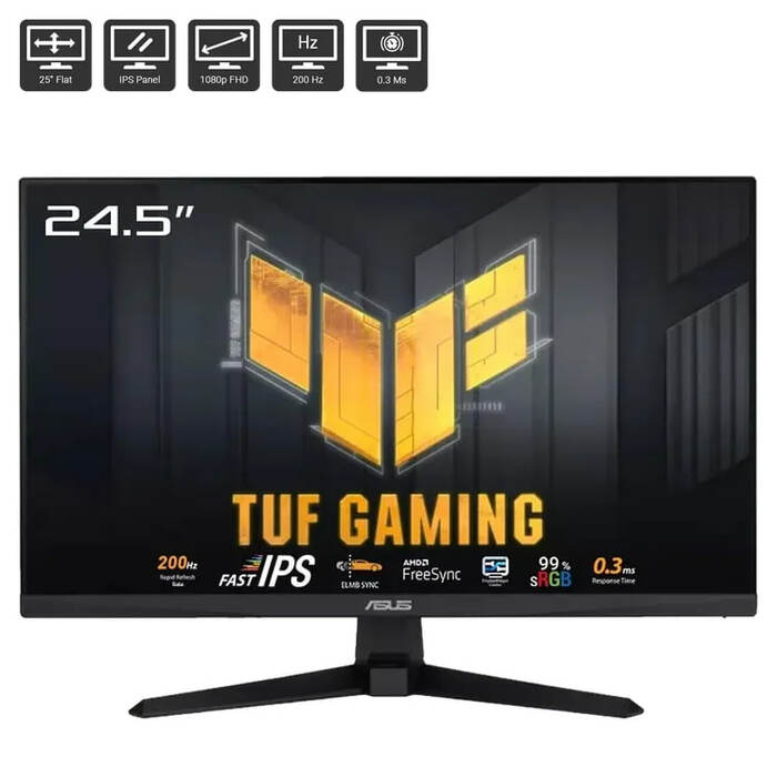 The 24.5-inch TUF Gaming VG259Q5A Full HD gaming monitor featuring a Fast IPS panel for blistering-fast 200 Hz gaming. ASUS Extreme Low Motion Blur and AMD FreeSync™ Premium, G-SYNC compatible(under processing), VESA AdaptiveSync technologies enables buttery-smooth gaming. In addition, it has a 99% sRGB gamut to offer exceptional colors and contrast.