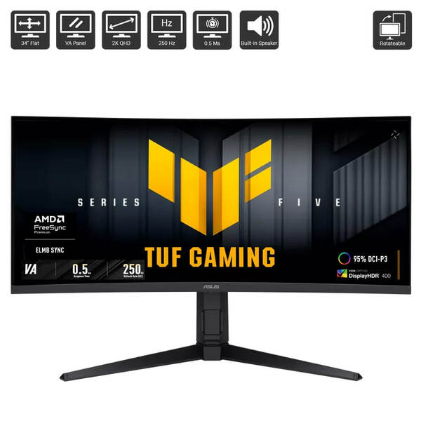 TUF Gaming Series 5 - VG34WQML5A gaming monitor ― 34-inch WQHD Fast VA panel, Curved design, 250Hz(OC), 0.5ms, AMD FreeSync™ Premium, Extreme Low Motion Blur, VESA DisplayHDR™ 400, 95% DCI-P3, DisplayWidget Center, Gaming AI