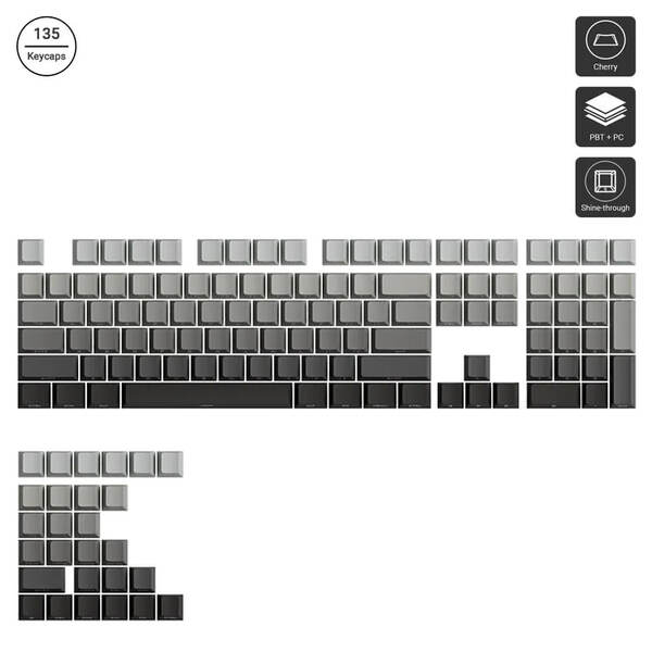 This gradient keycap set flows from soft gray to black, with side-printed legends, creating a sleek, minimal aesthetic that keeps the keyboard looking vibrant and far from dull.