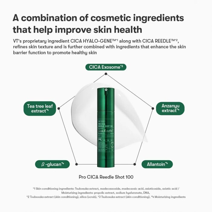 - ចំរាញ់ពី Centella asiatica acid ប្រឆាុំងនឹងការរលាករោល, Hyaluronic បីដង ផ្តល់សំណើម, Centella 4X complex និង ចំរាញ់ចេញពី Propolis ពណ៌បៃតង ដើម្បីជួយសម្រួល ផ្តល់សំណើម និង ពង្រឹងស្បែក