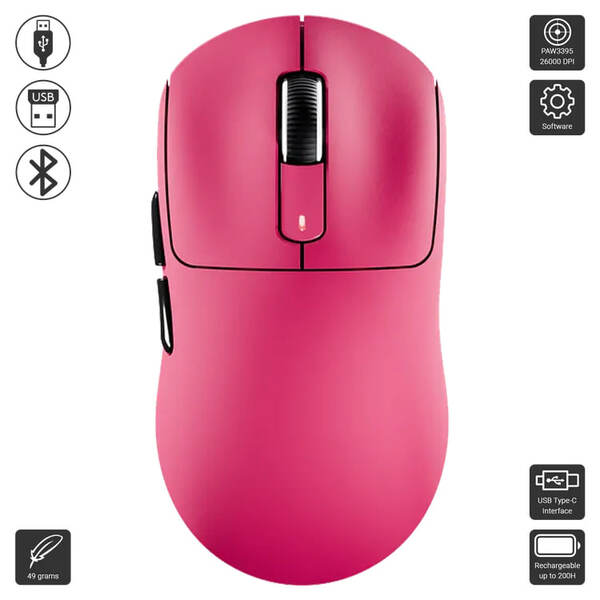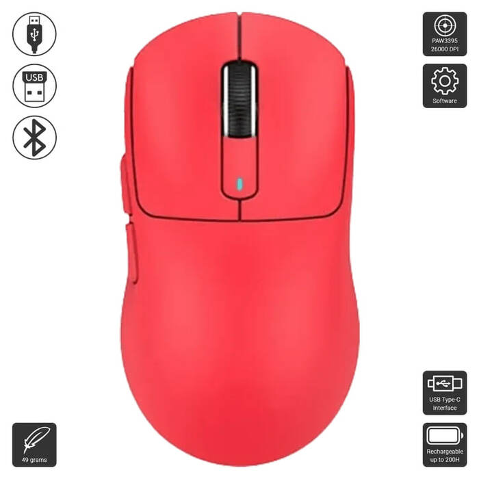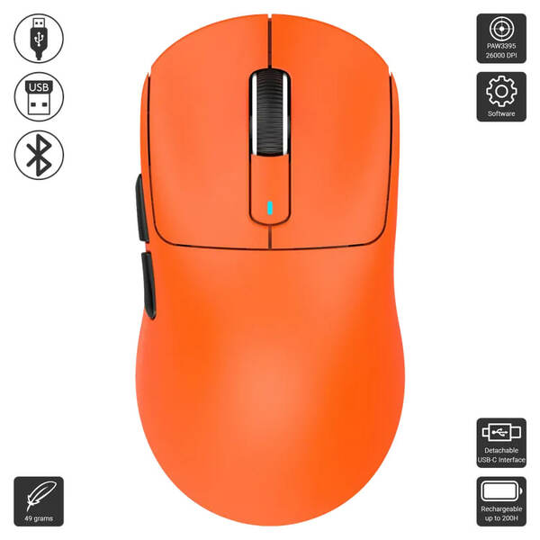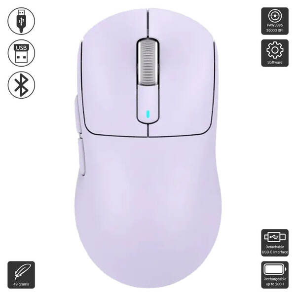 49g SUPERLIGHT, PixArt PAW3395 Gaming Sensor, BT/2.4G Wireless/Wired, 6 Adjustable DPI up to 26000, 200 hrs Battery