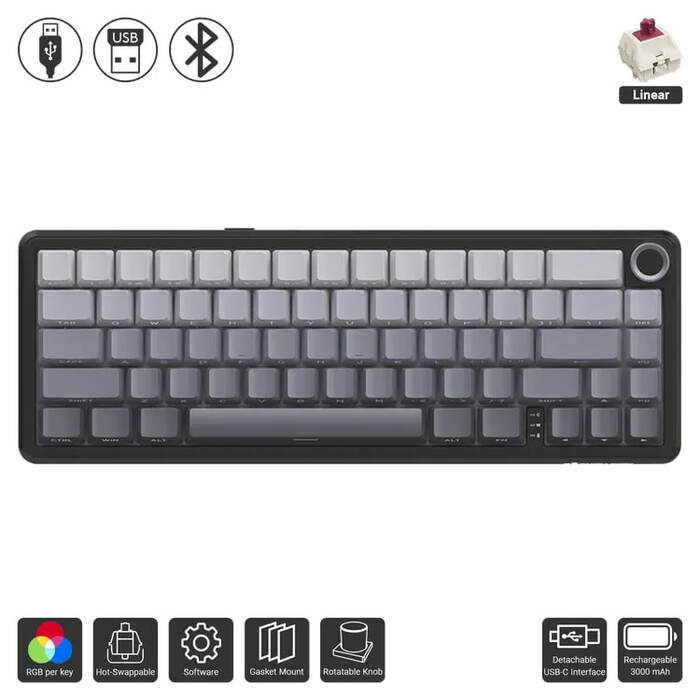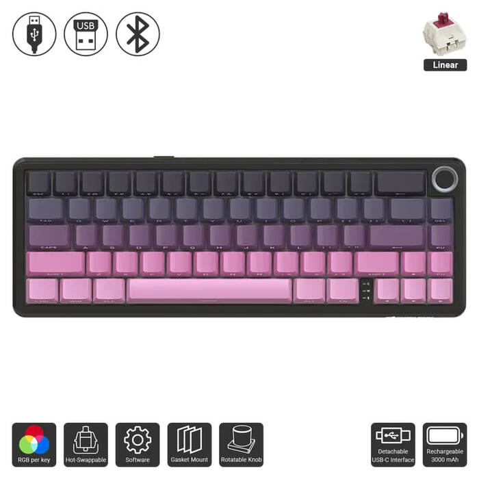 - Compact 65% Layout: A 66-key design with a volume knob, saving desk space while ensuring functionality.