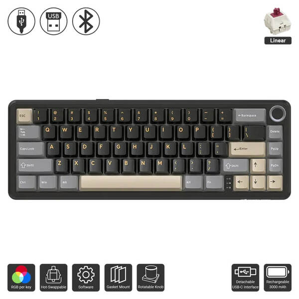 - Compact 65% Layout: A 66-key design with a volume knob, saving desk space while ensuring functionality.